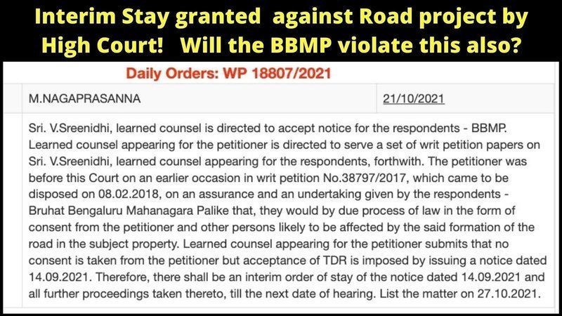 The Hon Judge granted a stay on all proceedings by the BBMP with regard to the Road project, and posted the case for next hearing on 27th Oct.