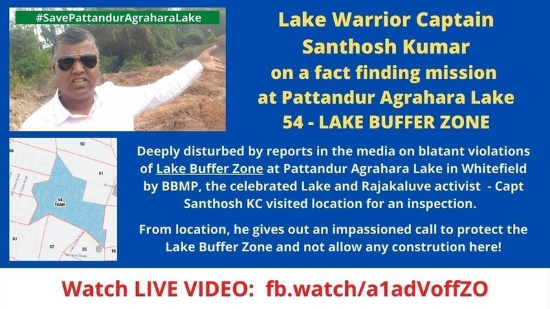 Deeply disturbed by reports in the media on blatant violations of Lake Buffer Zone at Pattandur Agrahara Lake in Whitefield by BBMP, the celebrated Lake and Rajakaluve Warrior - Capt Santhosh KC visited location for an inspection, early morning on Tue, 21 Dec 2021. An army veteran who now battles to safeguard water security and has been freeing up Lakes and Rajakaluves from encroachment across districts.