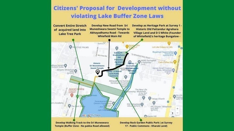 Citizen’s Proposal for Development of the entire area, to meet the connectivity needs to Sri Muneshwara Swamy temple, but also to develop the entire area’s Public Commons and Kharab Lands as Public Parks to provide lung space and sustainable Development for the area.
