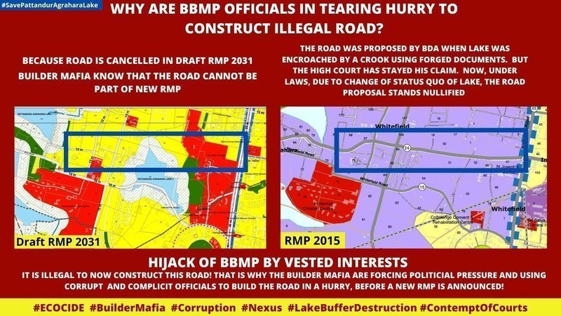 A Road project was erroneously proposed by BDA in RMP 2015; It was positioned on top of a LAKE which was not included in the map, because a crook had obtained a court decree using forged Land Tribunal Order. The revenue dept left the lake out.