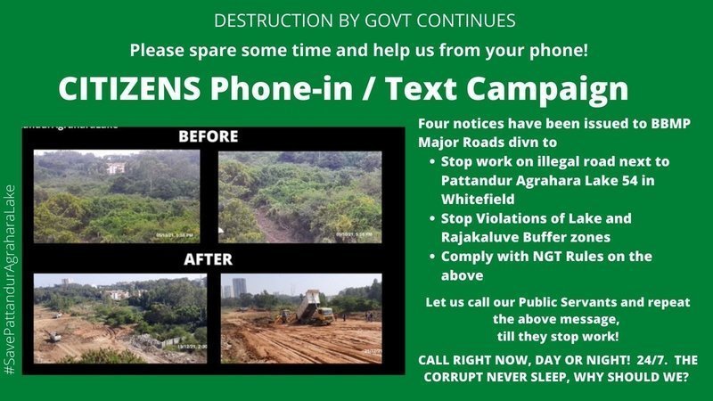 MESSAGE: "As a citizen, I request you to immediately SCRAP illegal road work at Pattandur Agrahara Lake 54 in Whitefield."