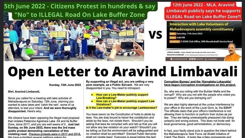 Not even a week has passed after our 3rd public protest against the Lake Buffer Zone violations, and the MLA of the area Mr. Aravind Limbavali drops a bombshell. He organised a meeting with Lake Activists, purportedly to collaborate with them to save lakes. And in this meeting, we questioned him about the illegal road project violating Lake Buffer and Rajakaluve Buffer Zones of Pattandur Agrahara lake, being pursued by the Govt. In a shocking reply, the elected representative said the illegal road should be built!!