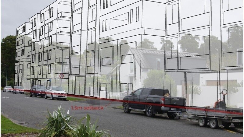 The image show what six storeys might look like on a suburban street in Christchurch. Imagine the impact of eight or nine storeys.