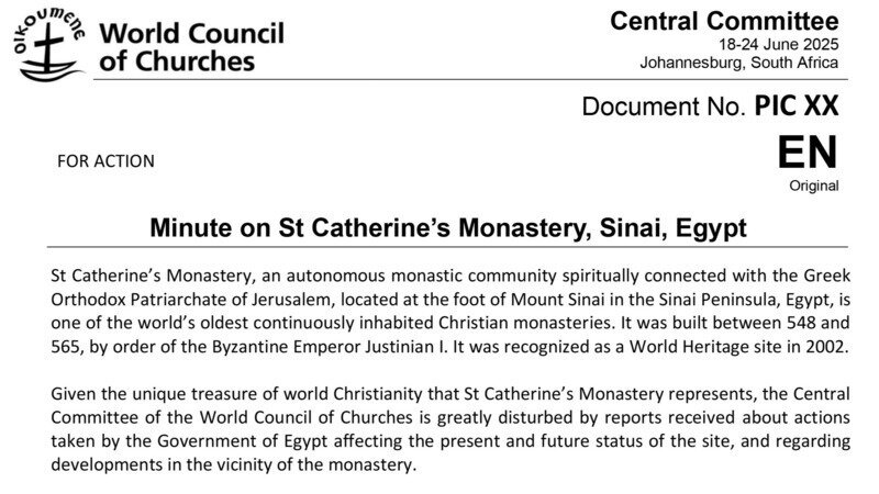 Atualização do abaixo-assinado🛑 Save Saint Catherine's Monastery — At Risk of Egyptian Government TakeoverWorld Council of Churches Central Committee