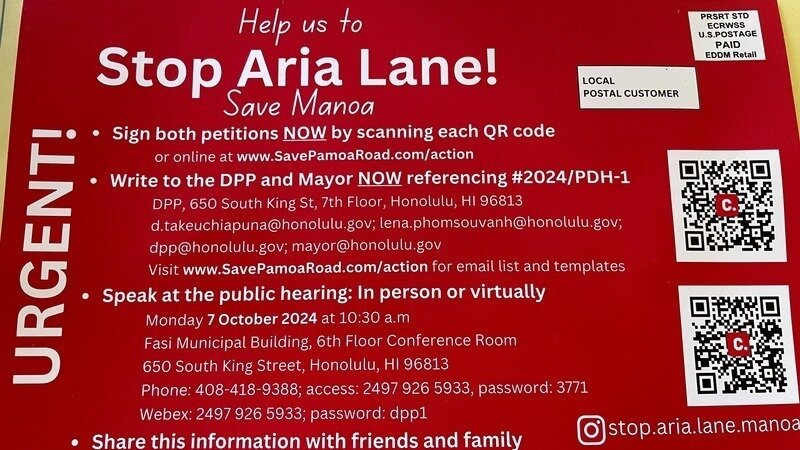 Share both the Save Saint Francis Manoa petition and the Stop Aria Lane Petition widely again, including by word of mouth (tell folks to google, that they are DONE as soon as they click on "sign this petition", do not donate, but do share)