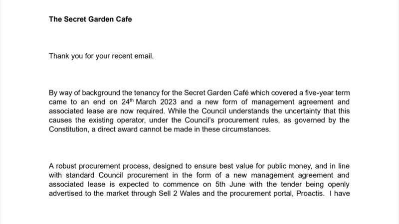 By way of background the tenancy for the Secret Garden Café which covered a five-year term came to an end on 24th March 2023 and a new form of management agreement and associated lease are now required. While the Council understands the uncertainty that this causes the existing operator, under the Council’s procurement rules, as governed by the Constitution, a direct award cannot be made in these circumstances.