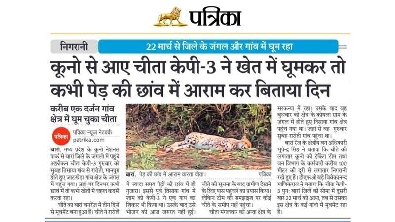 A recent news report (10 April 2026, Baran) notes the movement of a cheetah (KP-3), relocated from Kuno National Park, across forest and village areas in the district since 22 March.