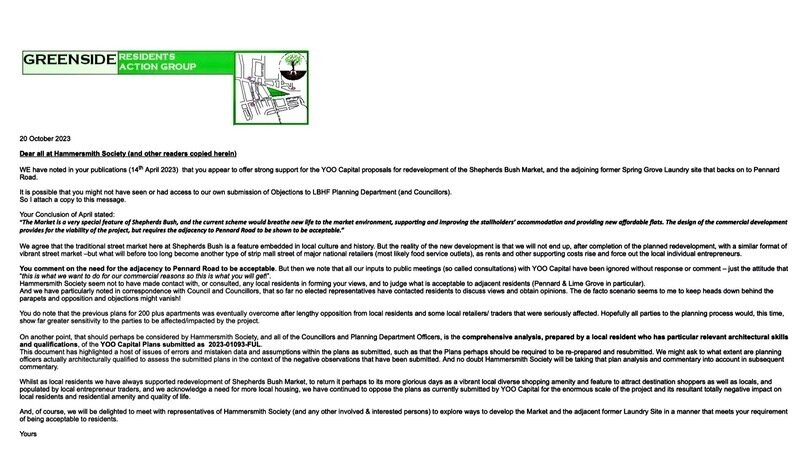The following letters from the Greenside Residents Action Group express deep concerns with both planning application reference 2023/01093/FUL and with the applicant YC Shepherd’s Bush Market Ltd.