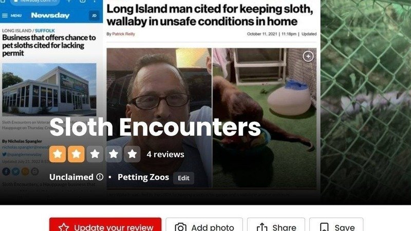 Facebook: Search: https://www.facebook.com/SlothEncountersLI/reviews Select "Does Not Recommend" and leave a review. (Some Facebook reviews posted from mobile devices are erroneously posting "Recommend" instead of "Does Not Recommend." Please confirm it posted correctly after you submit and if it is posting incorrectly as "Recommend", please try again from a computer instead of mobile device. It will otherwise RAISE the page's rating.)