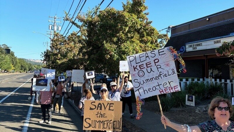 Tonight we had a great group of supporters holding signs and calling out to drivers on Summerfield Road to "Save the Summerfield" with many horns honking back in support. The cinema management team came out to greet us and gave us 20 complimentary movie tickets as a thank you. Photographer Chad Surmick from the Press Democrat took photos of the event (to be published soon).