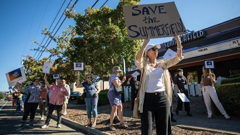 [Local movie buffs, including Jennie Richards, protest outside of Summerfield Cinemas on July 17, 2024, in an effort to save the beloved movie house from closing in Santa Rosa - credit: Photographer, Chad Surmick / The Press Democrat]