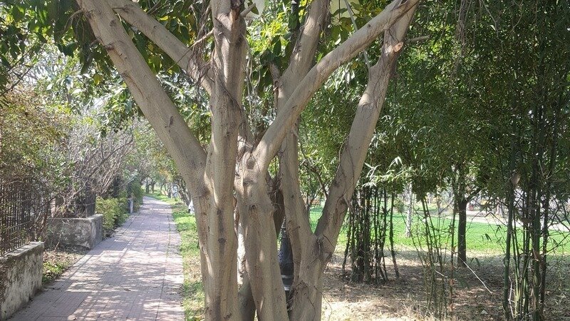 Plants: To name some of the species, the Park has Chinaar, Timroo, Mahua, Rudraksh and another variant, Kadamb, Apple tree (Hariman 99), Chyuri, Budha coconut, Casuarina, Chiraul (Holoptelia), Acrocarpus, Maulshree, Chorisia, Starfruit (karambola), Pilkhan, Goolar, Putranjiva, Baarna (Temple tree ), Fiddleleaf fig, Kat hal (jackfruit), Reetha, Kapur, (Cinnamomum camphora), Peacock tree, Pink shower tree (Cassia javanica), Sitaphal, Chikoo, White sandalwood, Arjun, Harad, Behda, Neem, Sita-Asoka, Shami, Giloy, Parijaat, Belpatri, Mehndi, Kadi patta, Peepal, Amaltaas, Gulmohar, Jacaranda, Nurmi, Leechi, Jasmine, Rubber Plant, Bottle brush, China rose, Panjtaara, Silver oak, Shahtoot, Silk cotton tree, Bombax cieba, (Semal), Kachnar, Plumeria different types, rubra/pudica, champa, Imli, Pine, Council tree, Lasooda, Taoooou (lakoocha, monkey fruit), Fakoda, Swanjnaa, Loghaat, Palaash, Kaimbal, Kimb, Gargal, Mosambi, Lemon tree, Loocha, Garna, Desi Aamvla, Banana, Chamba, Guava, Bamboo, Alstonia, Christmas tree, Sukhchain, Thavecia, Cassia fistula, Tacoma, Ficus, Duranta, Hamelia, Jamun, Kanakchampa, Chameli, Chandni, Raat ki Raani, Din kaa raja, Moti, Morpankhi, Pencil pine, Poinsettia etc., Tulsi (three types), Aparajita, Pudina, Patharchatt, Aloe vera, Stevia, Ashwagandha, Lemongrass, Elaichi etc.
