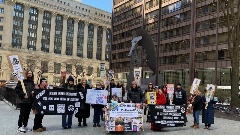 We stood in front of the Picasso statue, across from city Hall holding our signs and chanting our slogans. We passed out cards that our team had made, highlighting the crisis at CACC, calling on the Mayor to hire a new director who would care about the animals, have a can do attitude and be passionate about saving lives. We called for a No Kill Chicago.