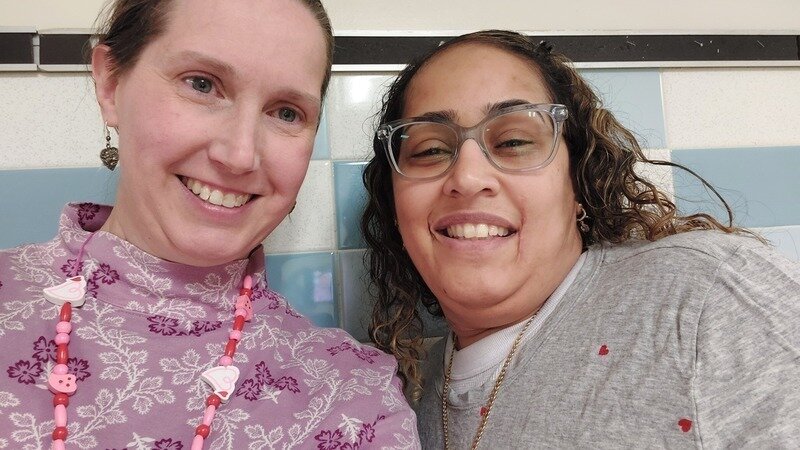 Photo above: Kimberly in purple turtleneck and heart earrings. Sanna in a heart print shirt.