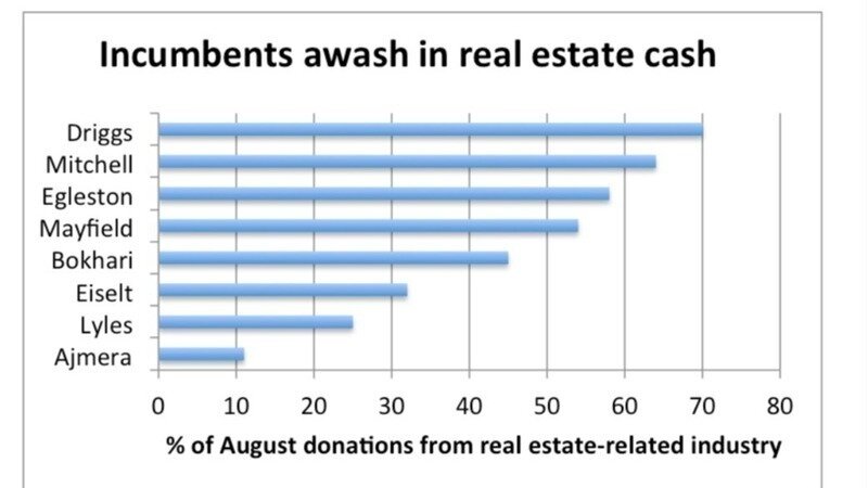 A review of the most recent campaign finance report from the North Carolina State Board of Elections shows Ed Driggs taking money from the usual suspects: Levine, Pappas, Northwood and Charter Properties. All big names in the real estate development game in Charlotte.