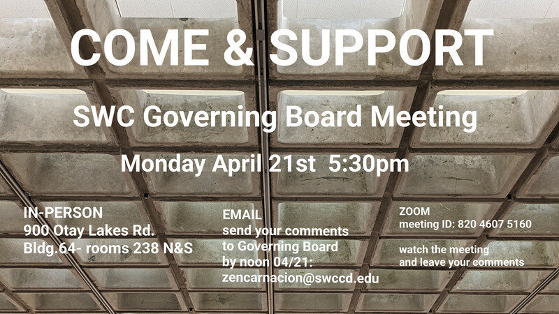 SWC Governing Board Meeting: Monday April 21st, starting at 5:30pm on the SWC campus (900 Otay Lakes Rd. Chula Vista) - Building 64-Rooms 238 N & S (these are the rooms directly across from the main Library entrance)