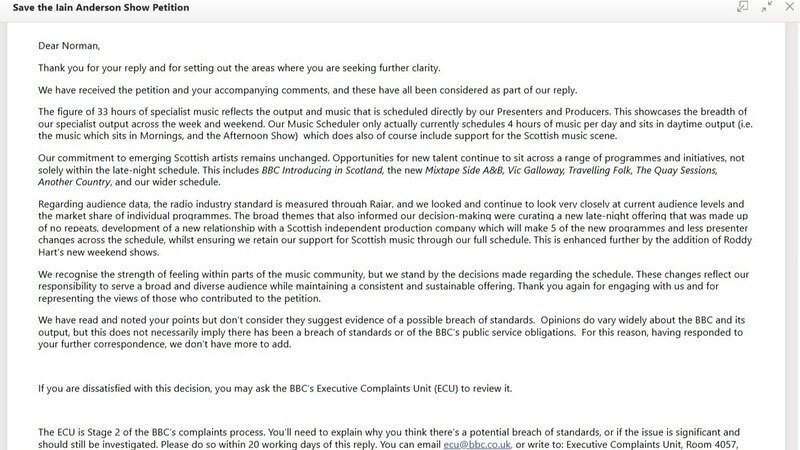 Neuigkeit zur PetitionSave The Iain Anderson Show – Reverse the BBC Radio Scotland decisionPetition : What Should We Do Next