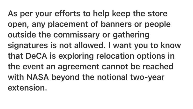 This was expected, but still is ridiculous. DeCA has sent an email to us stating that we are not allowed to hang any banners to inform people about the closure or the petition and we are not allowed in front of the store to gather signatures. Do they have any interest in keeping the commissary open?????