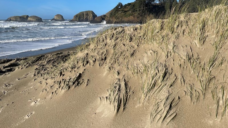 Recent storms along the Oregon Coast carried more sand into the European Beachgrass, raising the height of sand dunes along the coast. Blown sand nearly covers the Beachgrass here. Soon, the grass will grow back to normal height above the raised dune and be ready to catch more blowing sand in this unchecked process.