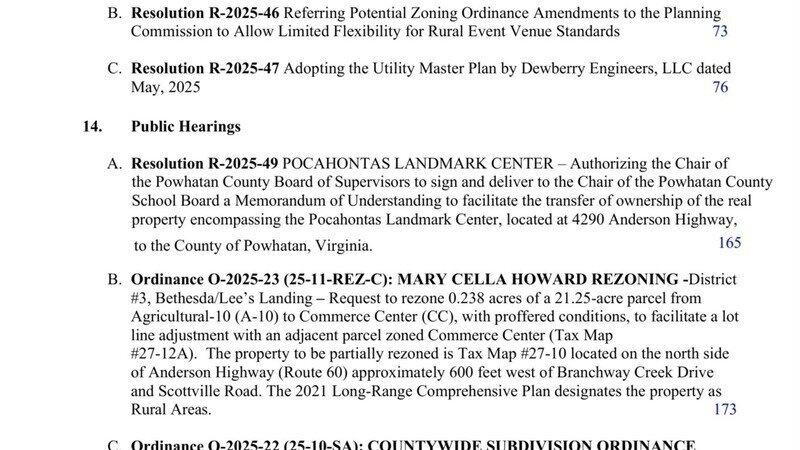 Item 14A is the discussion about Pocahontas, and comments will be limited to 3 minutes, per the Supervisors' website. You can go there to find the full agenda.