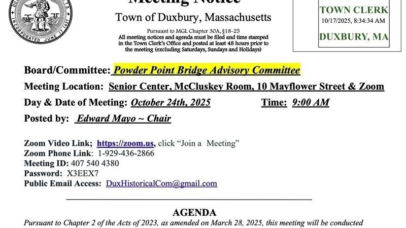 The Powder Point Bridge Advisory Committee is meeting this Friday at 9 am in the Duxbury Senior Center. People can also join via Zoom.
