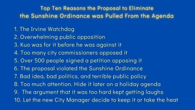 Last night the City Council deleted the item to rescind the Sunshine Ordinance from the meeting agenda. We view this as a temporary victory, and we have you to thank for it. However, the City Council can add the 2nd reading back to the agenda for a future meeting -- possibly during the holiday season while the attention of the public is diverted.