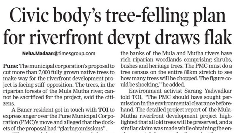 Neuigkeit zur PetitionSave Trees of Pune, STOP the proposal to fell thousands of trees in Mula Mutha river banksPune Municipal Corporation's tree-felling plan for riverfront development draws flak