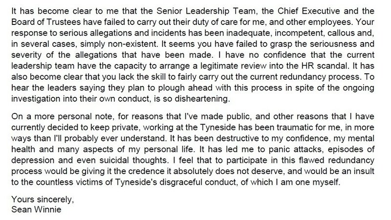 On a more personal note, for reasons that I've made public, and other reasons that I have currently decided to keep private, working at the Tyneside has been traumatic for me, in more ways than I'll probably ever understand. It had been destructive to my confidence, my mental health and many aspects of my personal life. It has led me to panic attacks, episodes of depression and even suicidal thoughts. I feel that to participate in this flawed redundancy process would be giving it the credence it absolutely does not deserve, and would be an insult to the countless victims of Tyneside's disgraceful conduct, of which I am one myself.