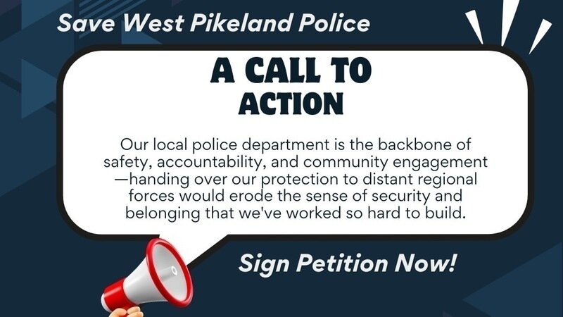 We, the undersigned residents, taxpayers and voters of West Pikeland township, express our continuing support for our West Pikeland Police Department and urge the Supervisors to continue to fund our Police Department.