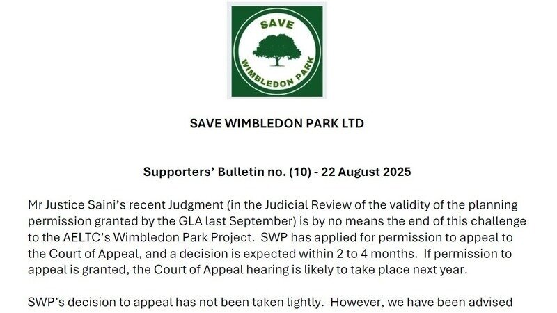 See the SWP website news: "Save Wimbledon Park Ltd Applies for Permission to Appeal to the Court of Appeal Following the High Court Decision in July on the AELTC Wimbledon Park Project + Supporters Bulletin 10"