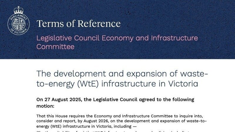 'The Committee will inquire into, consider and report on the development and expansion of waste-to-energy (WtE) infrastructure in Victoria including the suitability of existing WtE plans and policies, the impacts on residential communities and transport infrastructure, the cost benefit for consumers and businesses, how recycling and emissions are managed, other waste management options, new technologies that support a circular economy and the adequacy of community consultation.'