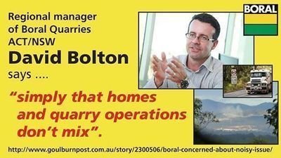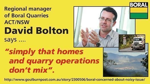 On May 23, 2014 Boral's own Regional manager of Boral Quarries ACT/NSW David Bolton admitted ... "homes and quarry operations don't mix". NSW Environment Protection Authority backed Boral's claims.