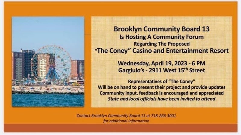 I wanted you to know that Brooklyn Community Board 13 (CB13) is having an upcoming forum for the community to share their thoughts and opinions on the proposed casino at 6:00pm this Wednesday, April 19, 2023 at Gargiulo’s Restaurant, 2911 W 15th Street (between Mermaid/Surf Avenues). There will be a rally outside before the meeting of people like you who are also saying NO to a casino. Feel free to attend. Bring friends. Bring neighbors. Bring signs.