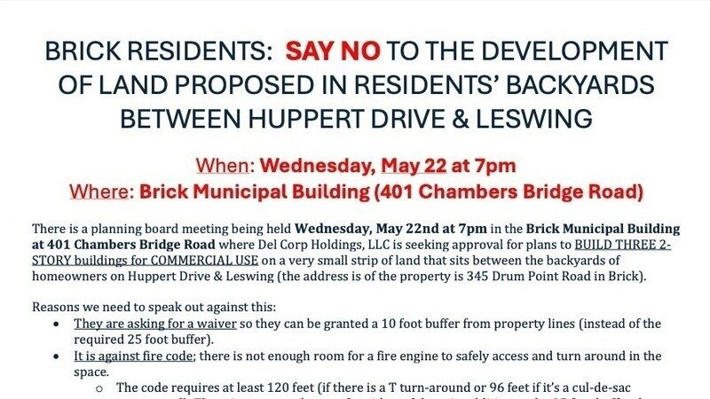 This is a reminder that there is a Planning Board Meeting on Wednesday, May 22nd at 7pm at the Municipal Building at 401 Chambers Bridge Rd in Brick to address proposed development at 345 Drum Point Road.