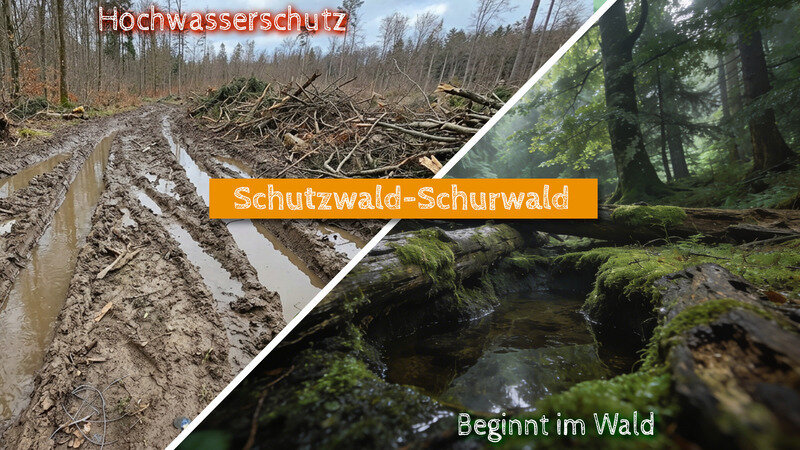 Die Broschüre ist dabei weit mehr als ein Informationsblatt – sie ist ein Werkzeug zum Handeln. Bürgerinitiativen finden darin fundierte Argumente, um lokalen Druck aufzubauen. Bürgermeister und Gemeinderäte erhalten konkrete, wissenschaftlich gestützte Grundlagen, um das Schwammwald-Prinzip in ihrer Gemeinde aktiv einzufordern und in der Forstpolitik zu verankern. Denn Hochwasserschutz beginnt nicht erst beim nächsten Unwetter – er beginnt heute, im Gemeinderat, in der Bürgerversammlung, im Wald vor unserer Haustür. Die Lösung liegt buchstäblich vor unseren Füßen: weniger Rückegassen, weniger Drainagekanäle, mehr ökologische Waldbewirtschaftung, ein politischer Rahmen, der den Wald endlich als das begreift, was er ist – unser bester, günstigster und schönster Hochwasserschutz. – der Schwammwald schützt, bevor Schäden entstehen.