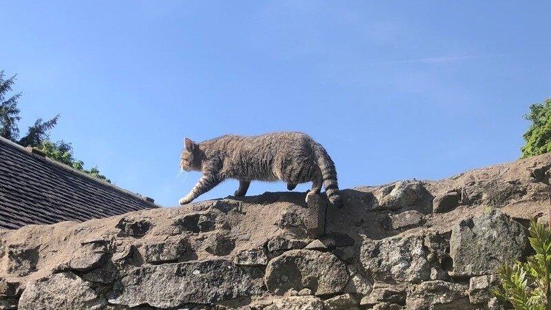We wanted to share this little snippet about just how resourceful and clever he is. After his period of acclimatisation, Finlay’s door was opened and he had the chance to walk free. Because he seemed so comfortable, we didn’t expect him to bolt away, we felt he was already relaxed and ‘homed’. He had a sniff around and then climbed on top of his stone barn and started to look around. However, what he did next was both amazing and terrifying. Next to his den barn is a much larger barn with a steep pitched roof. It would take a 4 foot leap onto smooth tiles to reach the higher roof, which is about 10 meters in height. Finlay was eyeing up the jump. Our hearts were in our mouths in case he couldn’t grip the roof and would suffer a serious fall. Finlay however just went for it, easily made the leap and without breaking stride, ran to the top of the roof. His agility, strength and grip were incredible to see. He then nonchalantly walked along the ridge of the roof to the end where he had the best view possible where proceeded to survey his new kingdom, orientating himself. He knew where the highest vantage point was and how to get there. He is one smart animal and constantly amazes us. He looked magnificent and it is a sight we will never forget. We will continue to update you on his adventures, but we wanted you all to know that he is safe and very well.