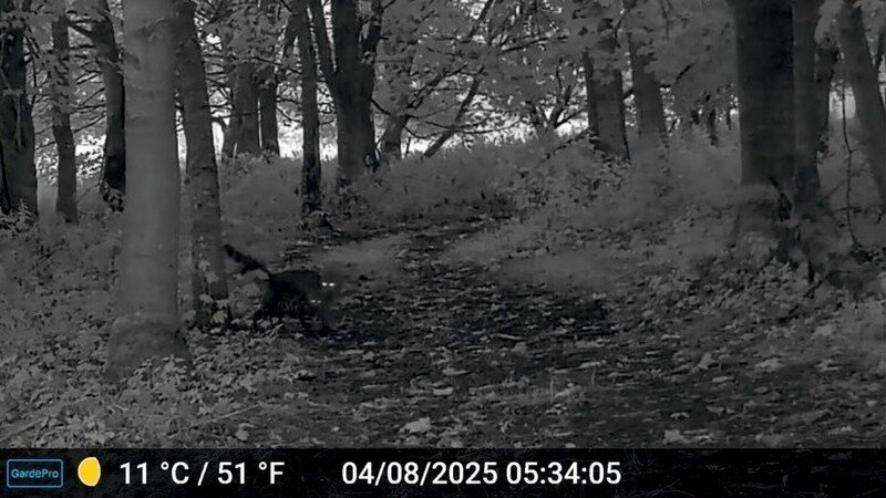 It is with great delight and excitement that we can confirm the beautiful female wildcat we have been monitoring, does indeed have a Kitten. We are beyond thrilled and we hope you all are too. We have only had a glimpse on a night camera but as you can see on the picture, there are definitely 2 sets of eyes glinting in the darkness. If you zoom in you can see the kitten tightly following Mum as they explore side by side. It is difficult to tell the age of the kitten, but it looks quite well developed. Most excitingly of all it looks to be a little ‘Humbug’. You can definitely see striping which is a very encouraging sign.