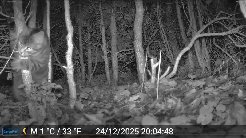 This is a video of one them and you will see by the date stamp that it was on Christmas eve. Very apt. This kitten is female and has set up a territory in an area of forest adjacent to Eve’s. She is clearly very happy and proud in her new territory as she is territory marking with vigour, rubbing her scent all over a scratching branch. This is how wildcats set territory boundaries just like tigers.