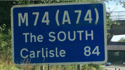 Add at least one blue road sign to the M74 to alert drivers heading south from Glasgow that there are two regions - Dumfries and Galloway and the Scottish Borders before you leave Scotland and reach Carlisle. Current signage south of Glasgow only contains "South" and "Carlisle" giving tourists and other travellers the impression that there is nothing between Glasgow and Carlisle.