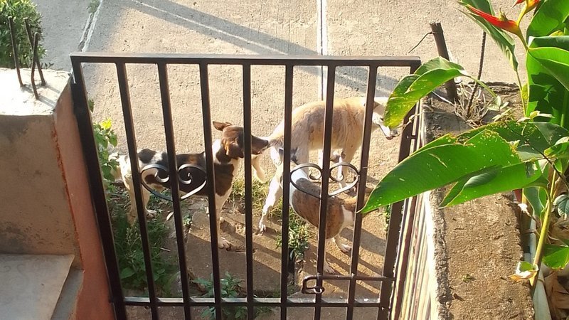 En El Salvador. Perros sin hogar acosando y violando a perrita....(Afuera de la casa de la rescatista amenazada por sus vecinos. No hay apoyo a los animales de compañía, aunque hay una ley a su favor)