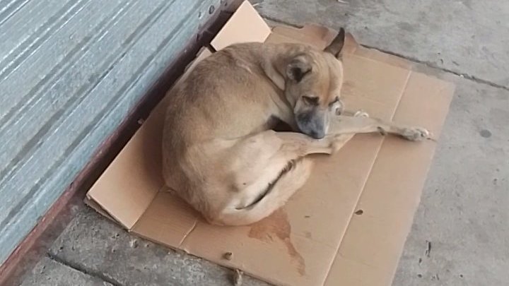 Este perrito está tan enfermo y tan adolorido, que a veces no puede ni levantarse para ir al baño. Como vemos en la foto, se hace ahi mismo. Tiene un constante fluido de sangre, debido a una enfermedad. Padece hambre, sed, dolor, soledad, temor...y todos esos sentimientos terribles para un ser vivo. Además, ahora le aflige la sombra de muerte que se cierne sobre él. Ya que a fin de este mes, cuando me paguen en el trabajo. Lo llevaré al veterinario, si no se pudiera hacer nada por el, lo pondré a dormir. No soy dueña de su vida. Pero, puedo dejarlo ir con dignidad, y acortar su sufrimiento. Perdoname, perrito sin hogar...