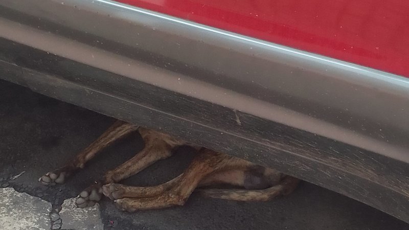 El calor insoportable de mi pais. Los animales que no tienen acceso a techo, se ven obligados a refugiarse bajo los autos, en un intento de tener un poco de descanso del sol ardiente. No hay refugios, no hay campañas de esterilizacion, no hay apoyo economico para los rescatistas que se encargan de andar haciendo filas en las campañas de esterilizacion a bajo costo en las veterinarias de san salvador. (Imagen tomada por la rescatista en El Salvador)