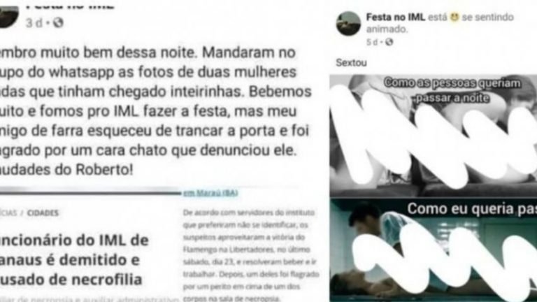 Grupo no Facebook chamado "Festa no IML", contando com a participação de funcionários do Instituto Médico Legal incentiva a prática criminosa da necrofilia (excitação sexual por contato ou apenas visão de um cadáver).