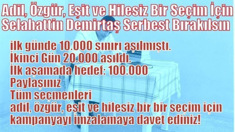 Petition updateSelahattin Demirtaş Serbest Bırakılsınİkinci gün tamamlanmadan 20.000 aşıldı, İlk aşamada hedef 100.000