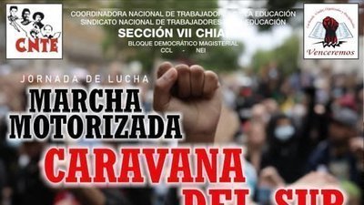 Los días 22, 23 y 24 de marzo de 2021, la Caravana del Sur formada por el Movimiento Magisterial y Popular de Chiapas recorrerá pueblos y ciudades de Oaxaca, Veracruz, Puebla y el estado de México, en el marco de la Jornada de Lucha Permanente y la Ruta Política Integral de la Coordinadora Nacional de Trabajadores de la Educación (CNTE), para hacer un enérgico llamado al Presidente de la República, al Congreso de la Unión y a la Suprema Corte de Justicia de la Nación para que den marcha atrás a su política de privatización de la educación y de mutilación a los derechos laborales, sindicales y profesionales de los trabajadores de la educación, el establecimiento inmediato de la Mesa Central.