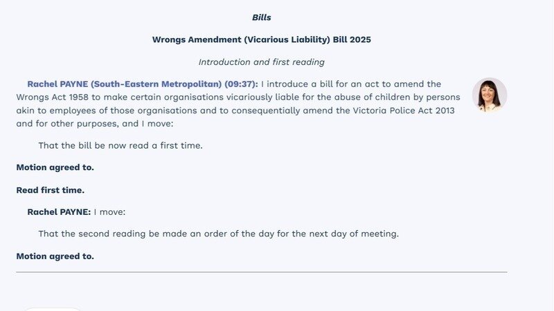 This week on 19 February 2025 Rachel Payne MP introduced a bill for an act to amend the Wrongs Act 1958 to make certain organisations vicariously liable for the abuse of children by persons akin to employees of those organisations and to consequentially amend the Victoria Police Act 2013 and for other purposes.