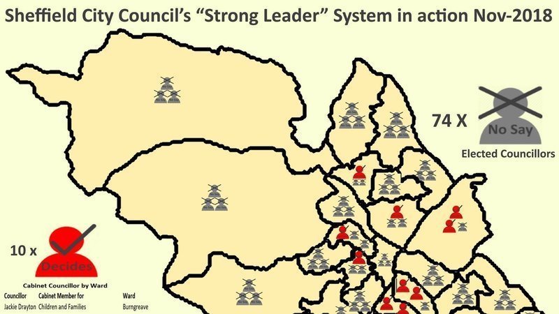 Sheffield elects 84 local councillors, 3 per ward, but only 10 of them actually hold all the power...and ultimately the Strong Leader can overrule anything. So what’s the point in having the other 74? Even the other 46 ‘back bench’ Labour councillors have to follow the whip or face being suspended for a month. Most of us in Sheffield are therefore not being properly represented. This is not what people think they have voted for. They think they have voted for a committee.
