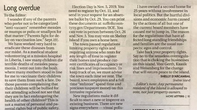 The Pro STR ticket is: Gerth, Kaasik and Weisenberg. All three have pledged to REPEAL this awful law. Your vote COUNTS on Shelter Island!