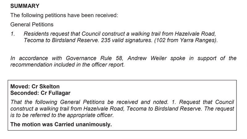 1. Residents request that Council construct a walking trail from Hazelvale Road, Tecoma to Birdsland Reserve. 235 valid signatures. (102 from Yarra Ranges). In accordance with Governance Rule 58, Andrew Weiler spoke in support of the recommendation included in the officer report.