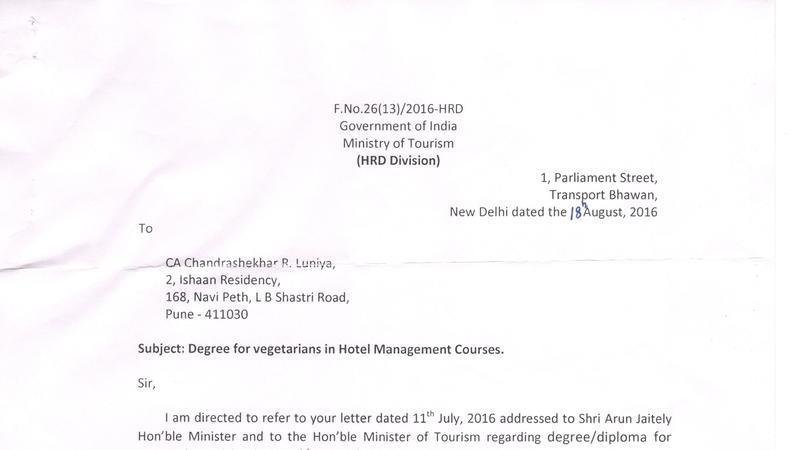 Happy New Year, Dear Supporters, After Convincing Successfully. Tourism Ministry, Government of India has happily announced Giving Option of Learning Vegetarian only in 3 Central Government IHM (Institute of Hotel Management) immediately and in 18 IHM from next year. Now, We will be requesting all the IHM at Universities Government as well as Deemed, State Government and privately owned Institutions, to give option of learning Vegetarian only in their Institutions. So, I request you to meet Members of Parliaments, Chief Ministers, Education and Tourism Ministers, Management of IHM and Convince them the need of Option of Vegetarian Degree.